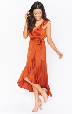 Show Me Your Mumu Samantha Ruffle Wrap Dress ~ Burnt Orange Luxe Satin