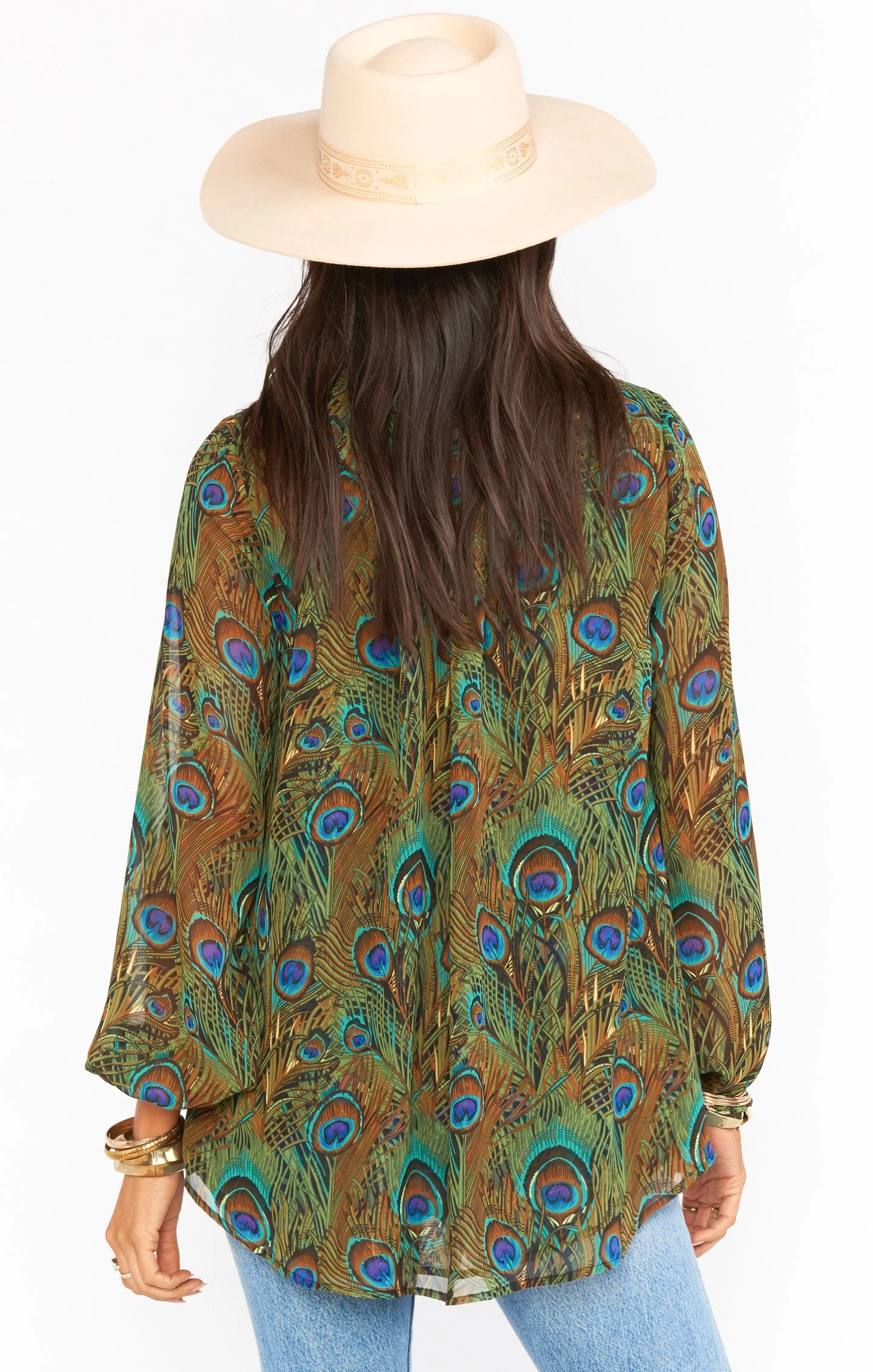 The perfect boho tunic with a feathery peacock print! This tunic features ruffled detailing around the collar, tie front detail, front button down closures and delicate balloon sleeves. So soft and flowy you’ll never want to take the Alicia Tunic off!