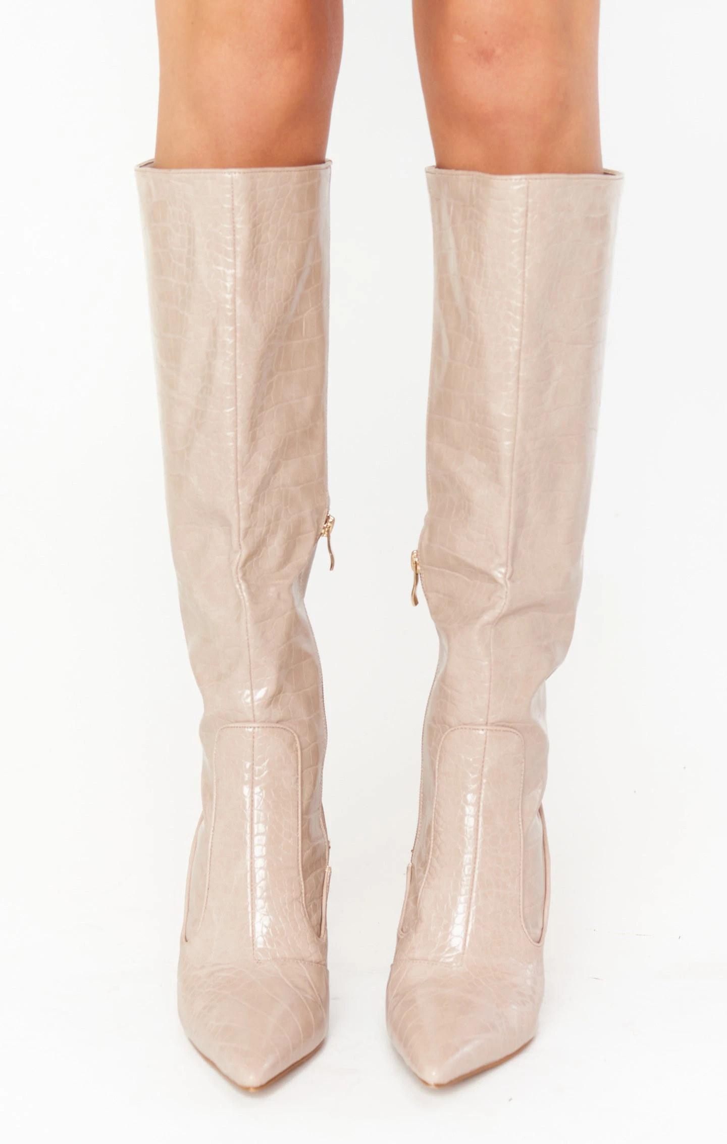 Laurie is a statement long boot finished in a luxe croc look. This boot is the perfect finishing touch that will elevate your wardrobe.