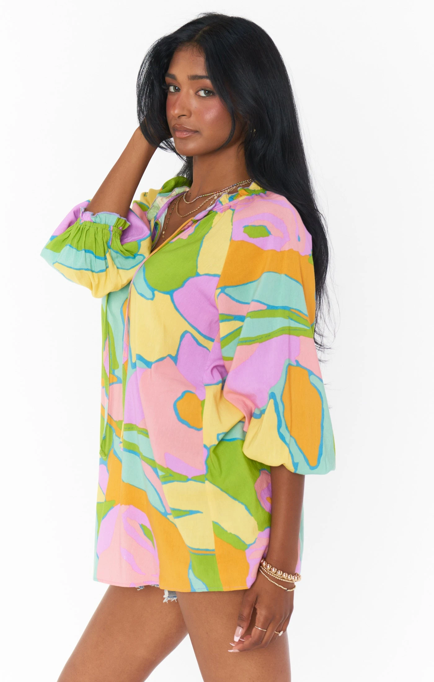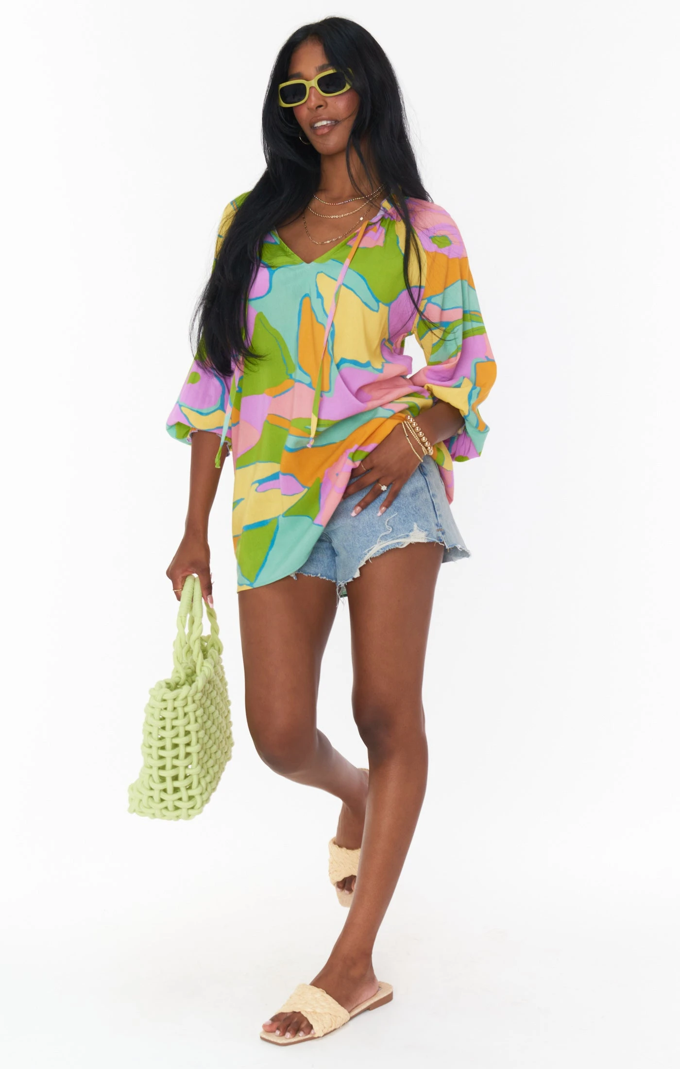 Let the Char Tunic in Summer Sorbet brighten up your day! A retro-inspired print in shades of orange, yellow, purple, and green color this relaxed tunic. Peasant sleeves complimented by a v neckline and hanging tassels give off a carefree boho vibe. Hit the boardwalk with your favorite sunnies and denim cutoffs.