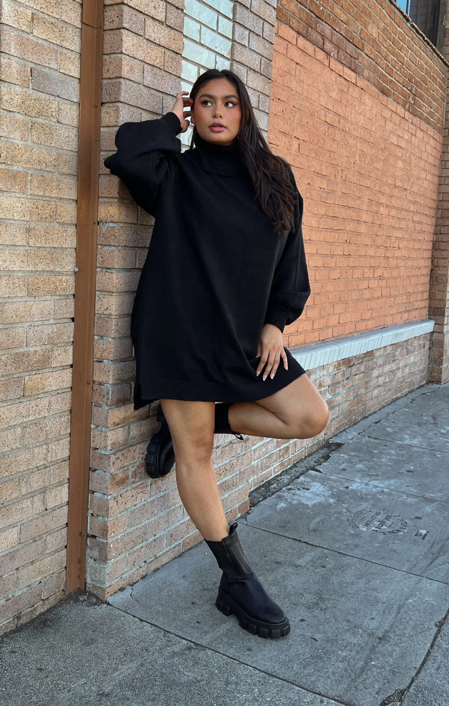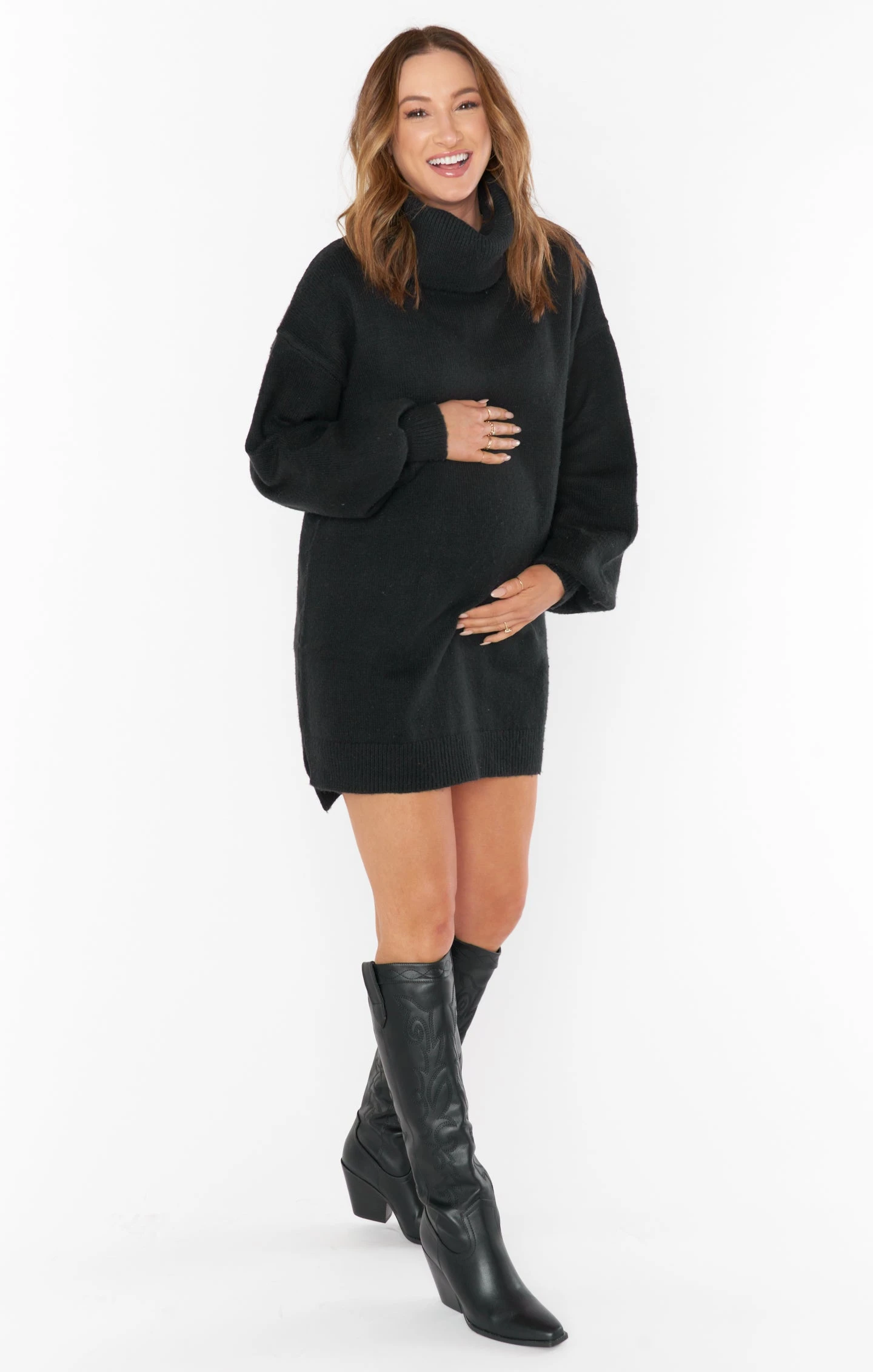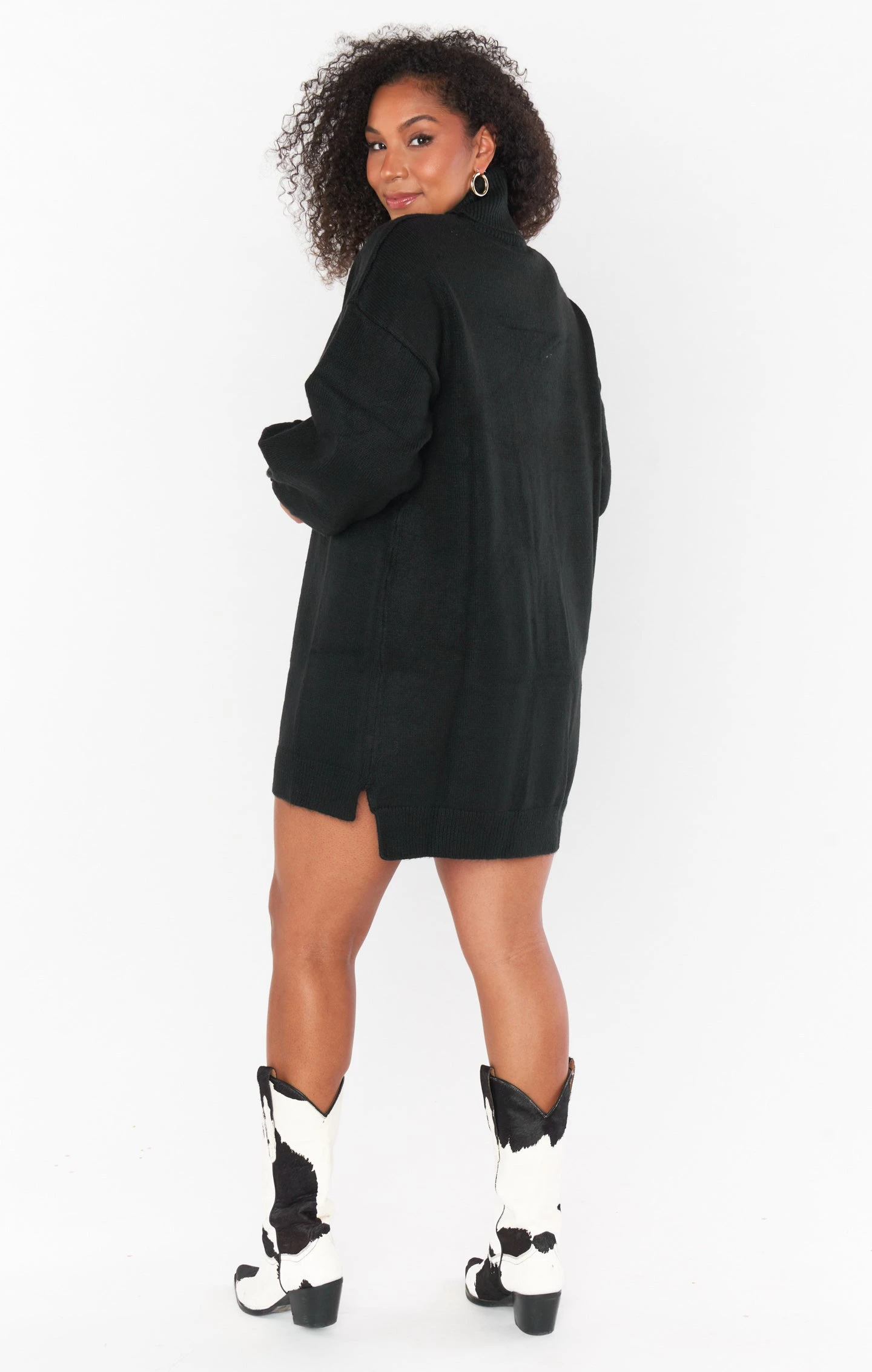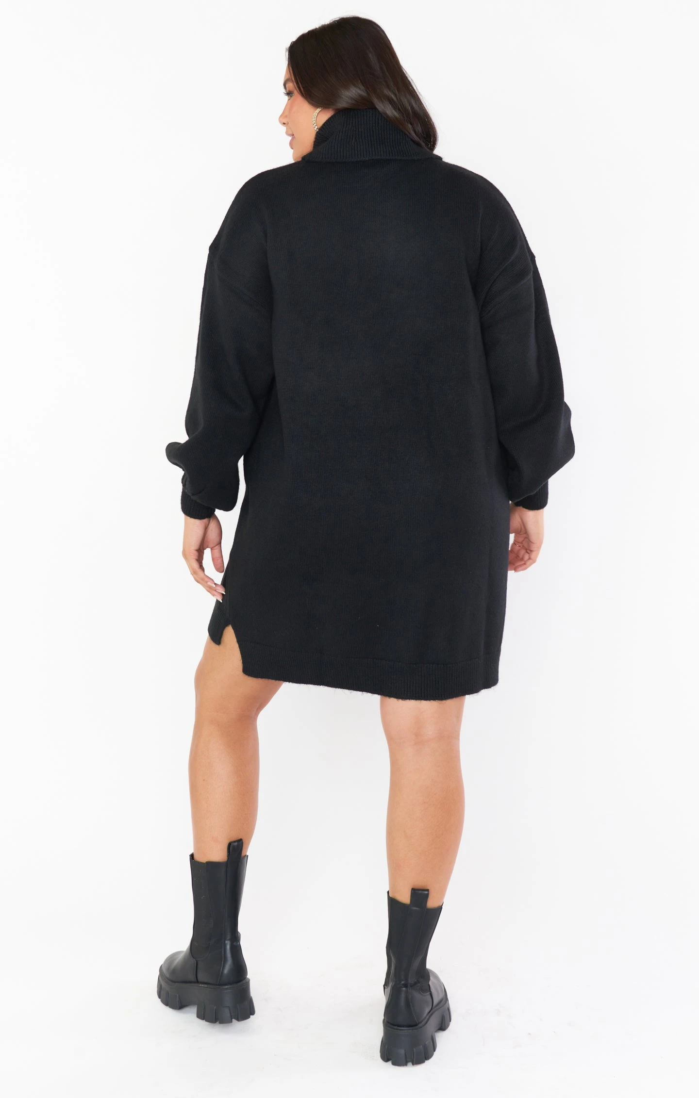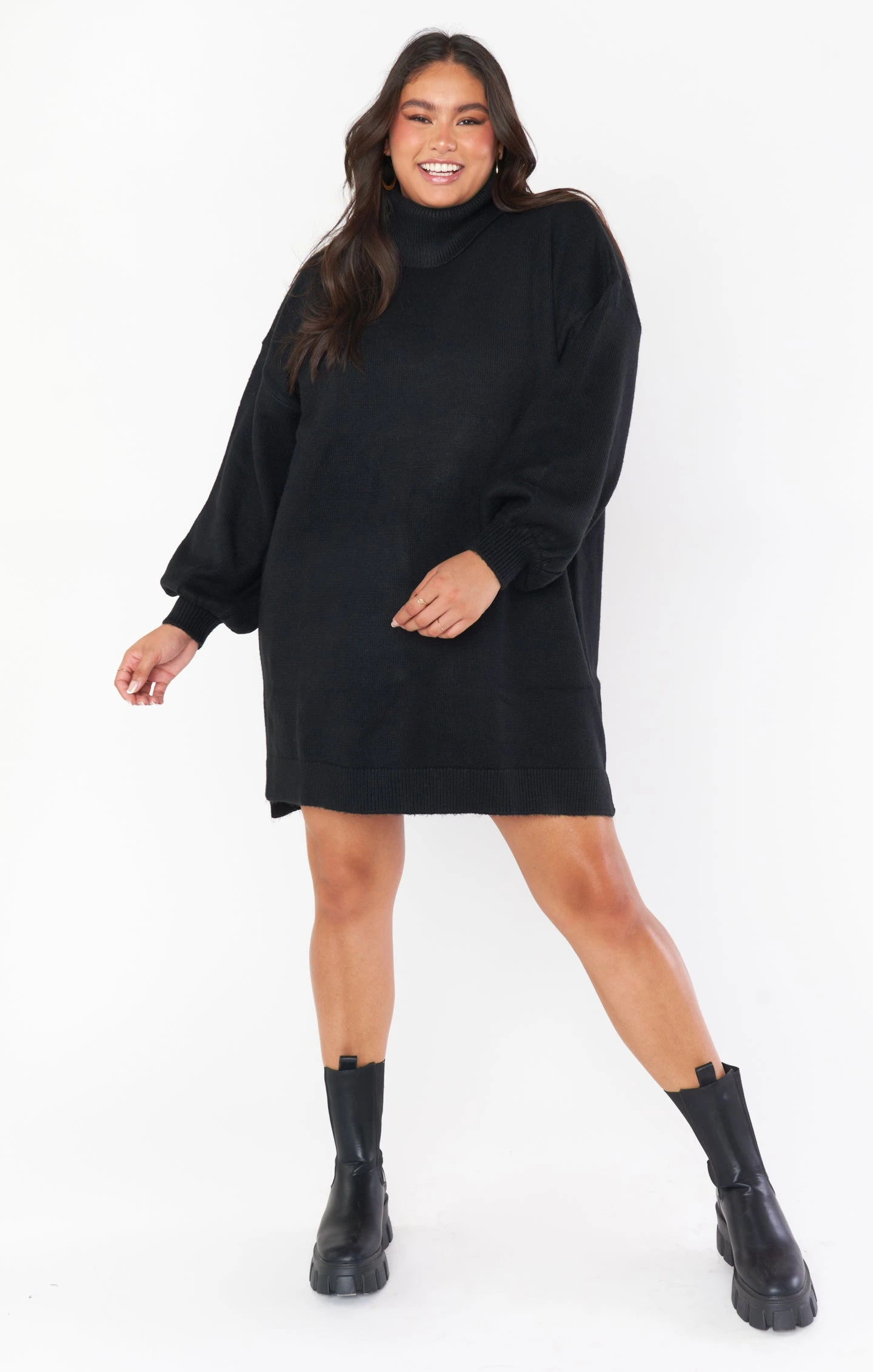 This black sweater dress has mastered the comfy-chic look! She’s a turtleneck dress with perfect balloon sleeves, this knit mini is an effortless closet must-have!
