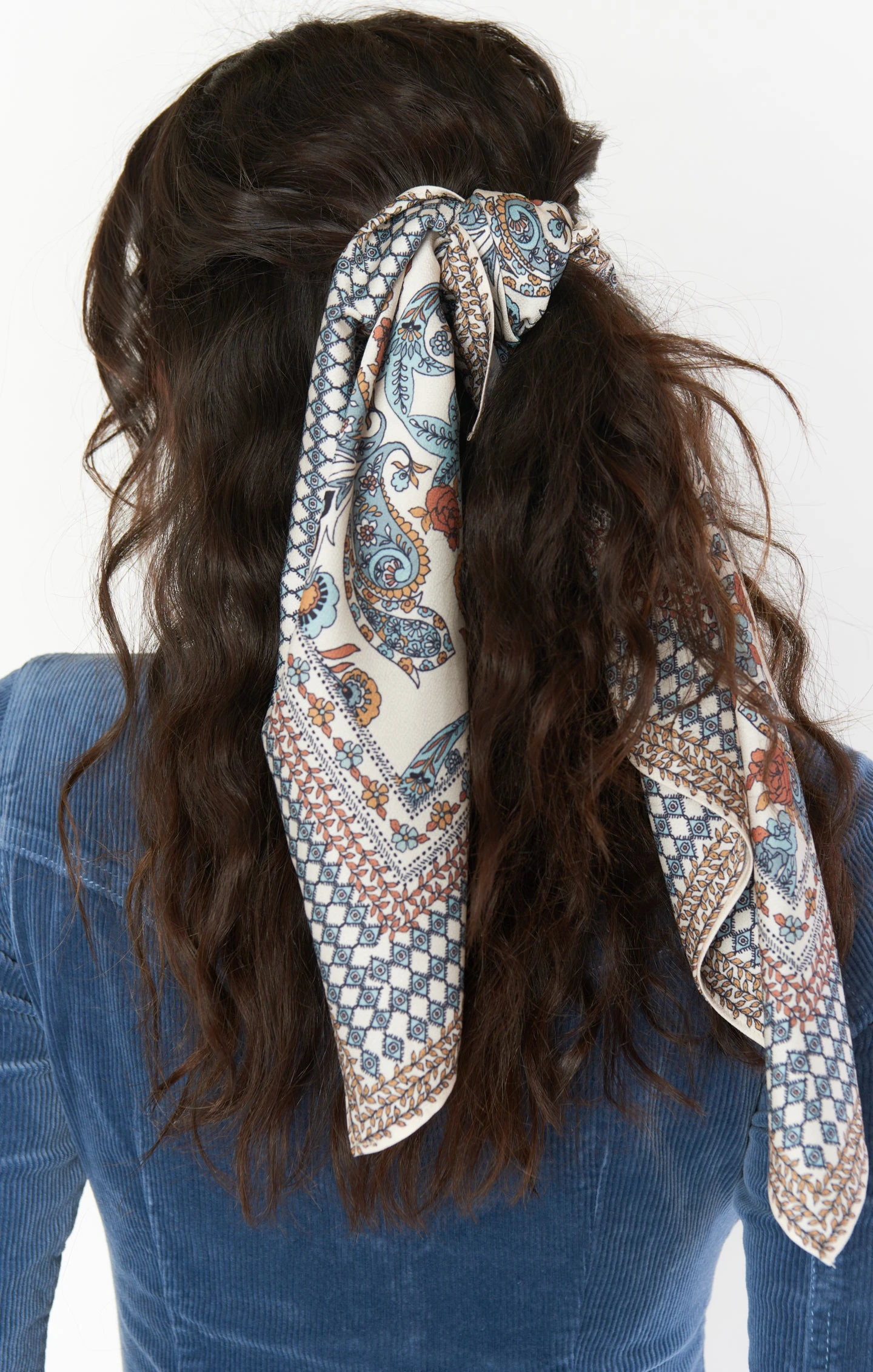 This vintage inspired scarf is going to become your most versatile accessory! Tie her around your head or pony tail as a hair accessory, or wear around your favorite straw bag to elevate your entire look.