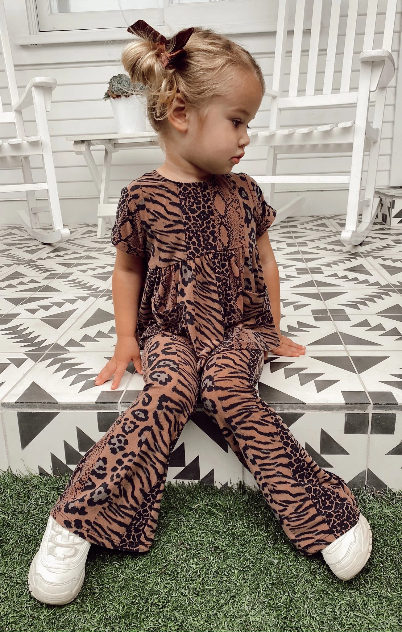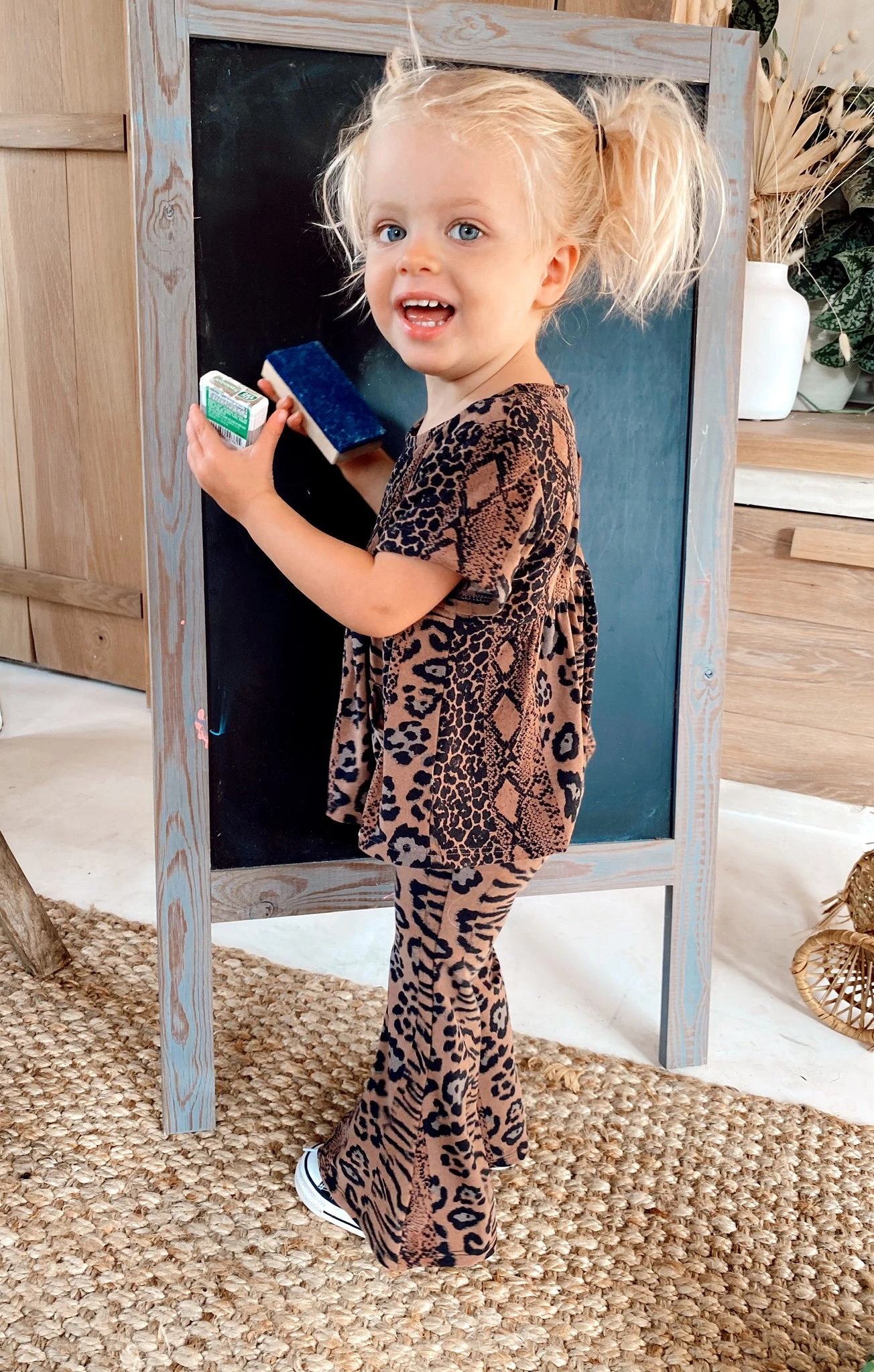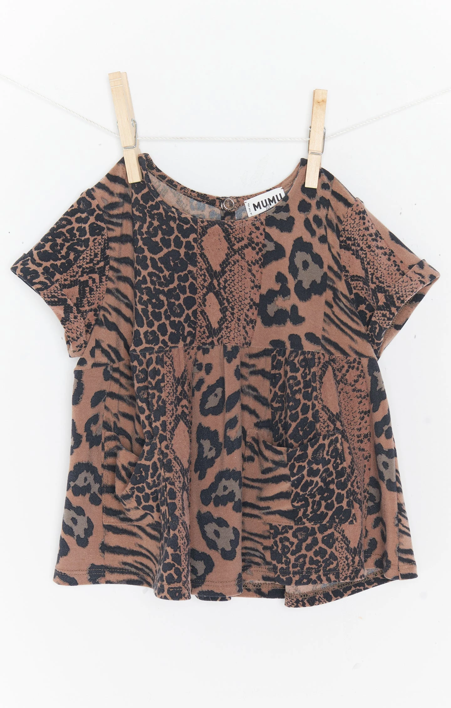 Play all day in the perfect little animal print tunic! This top has two mini front pockets and cuffed sleeves with two snap buttons in the back