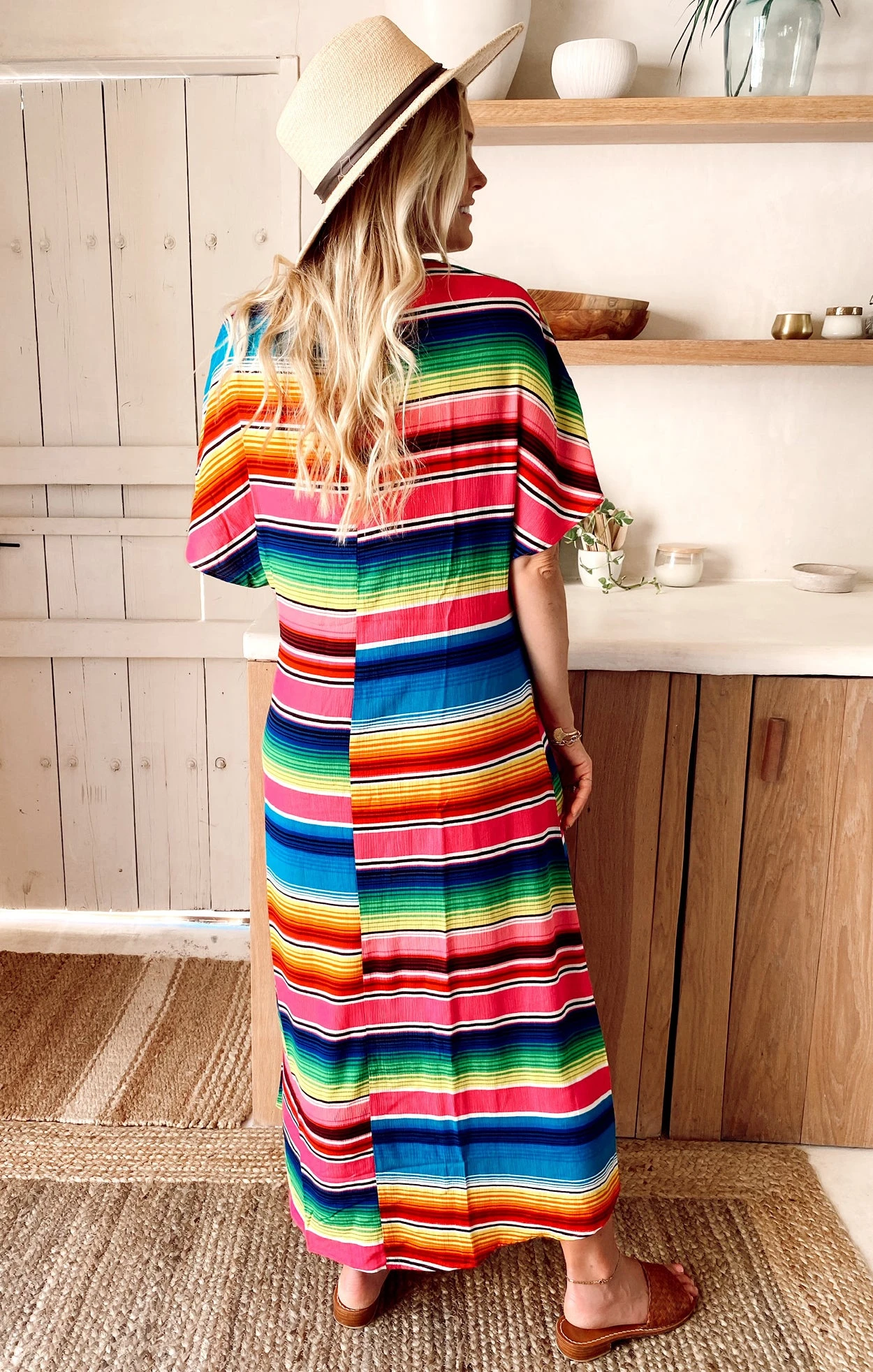 The Get Twisted in Serape Party has a gathered center that gives this lightweight maxi dress a beautiful draped look. She has a flirty side slit and flowy silhouette that pairs perfectly with strappy sandals and sunnies!