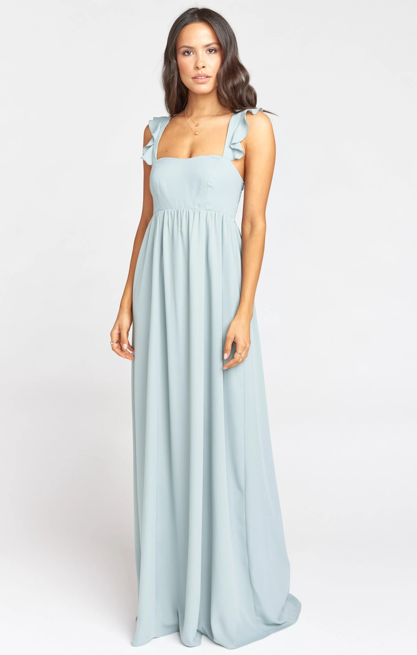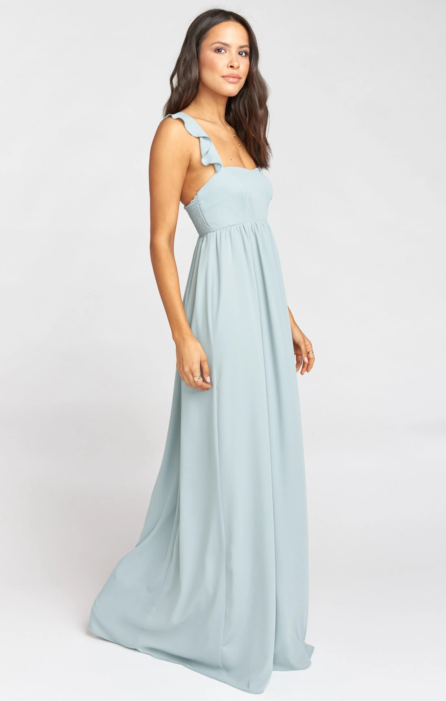 The June Maxi Dress is a bridesmaid dress that keeps it flirty while still being elegant. This dress features ruffle detailing along the straps, a smocked elastic back panel for a perfect fit, and an empire waist met with a full skirt.
