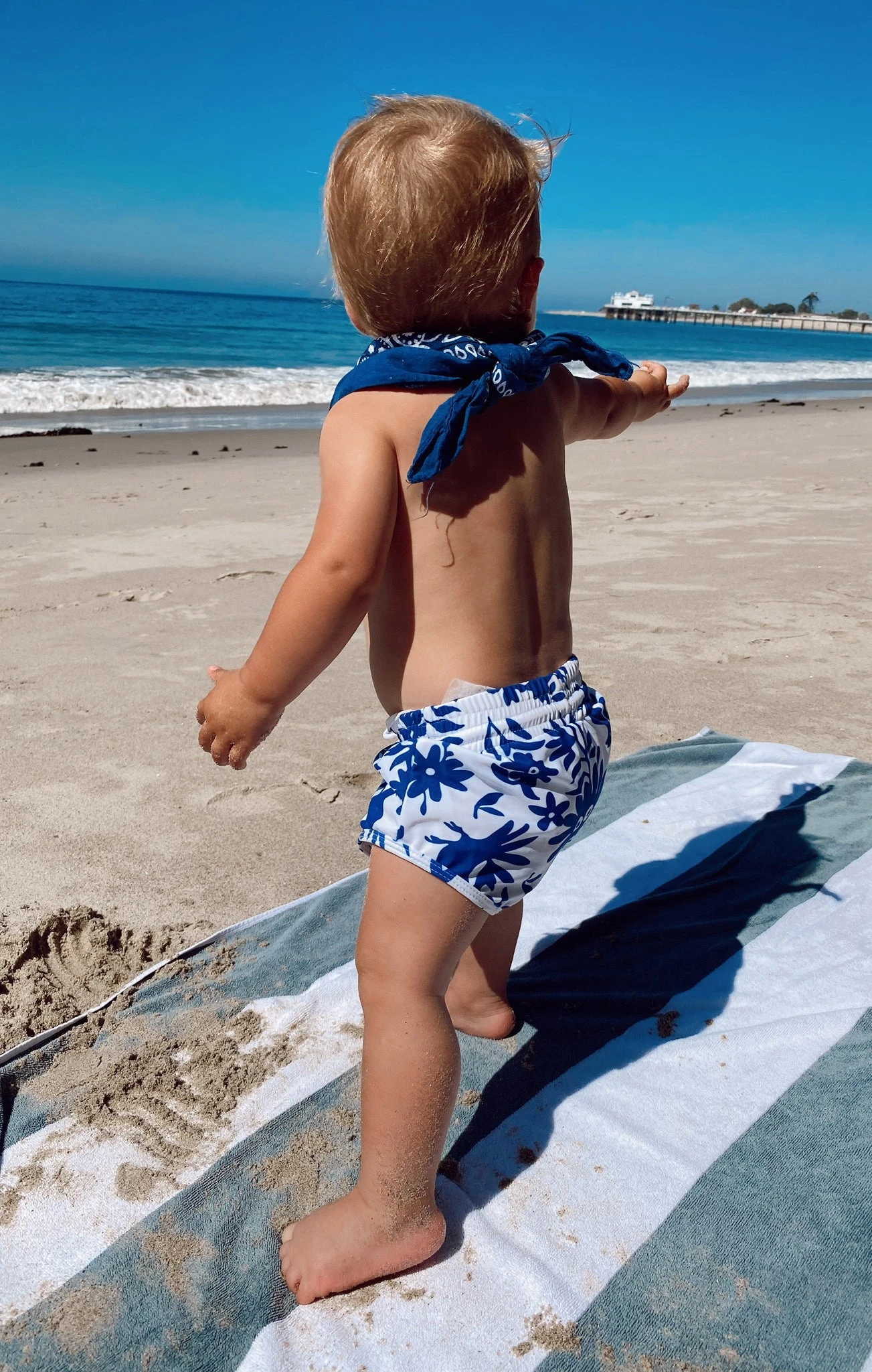 Your baby will be looking cute in these new blue and white swim shorts. These shorts have an elastic waist with a drawstring.