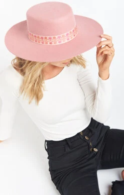 This wide brimmed boater style is the luxury piece you’ve been waiting for. Features vintage pink patterned ribbon that glistens in the sunshine.