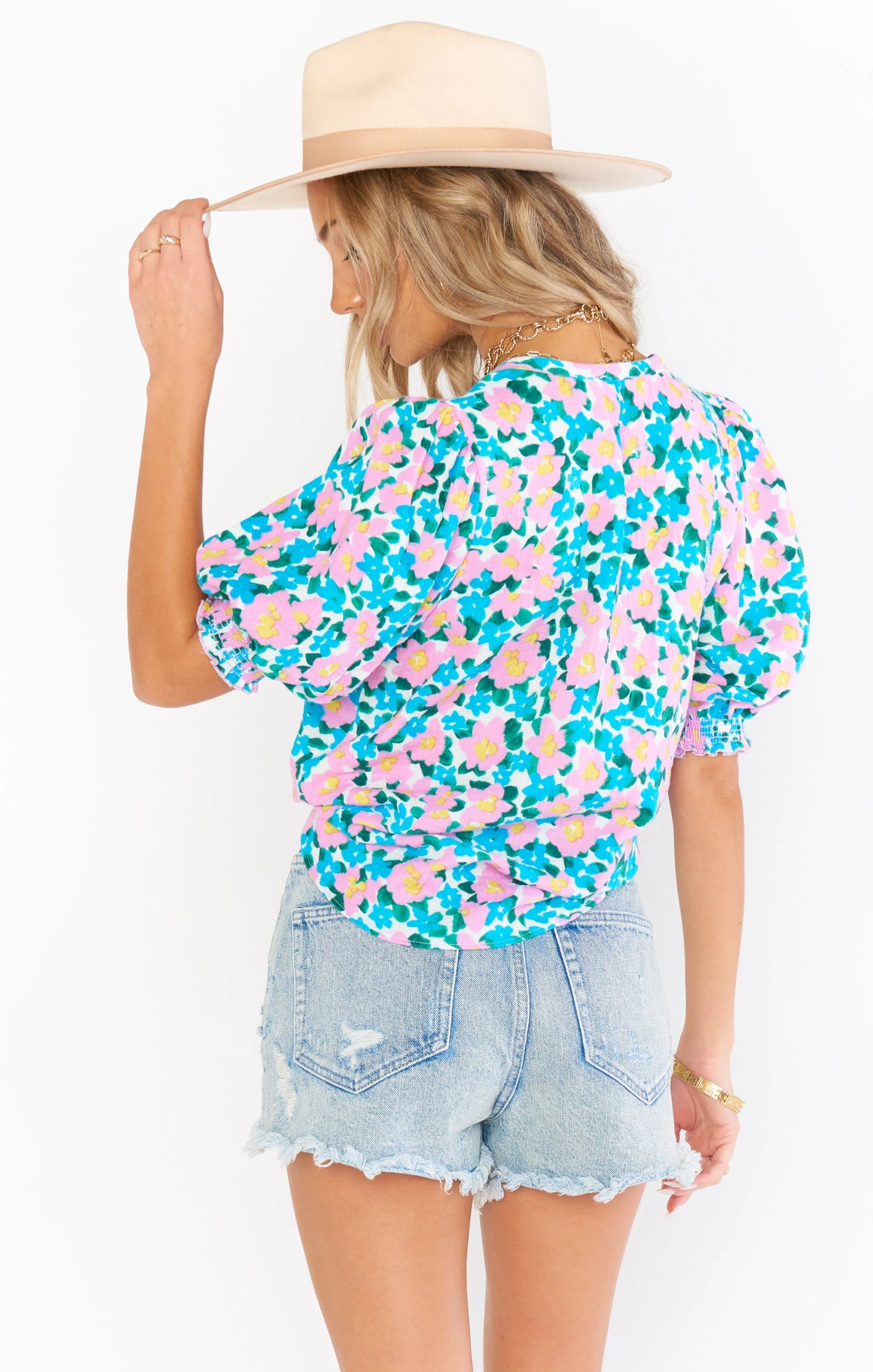 Flirty, fun and floral in this puff-sleeve, button up blouse. Leave out and flowy for bopping around town, and tie-up with cut offs for drinks with the girls!