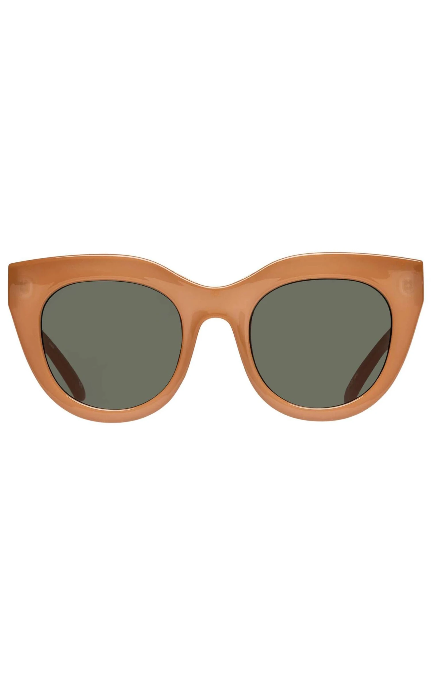 A favorite of Meghan Markle and Olivia Palermo, the Air Heart silhouette is an iconic Le Specs style. With proportions reminiscent of a cat eye, the style is designed with a thick caramel frame and luxurious metal top bar inlay, then fitted with premium zero base khaki grad flat lenses. The perfect sunglass to suit all face shape