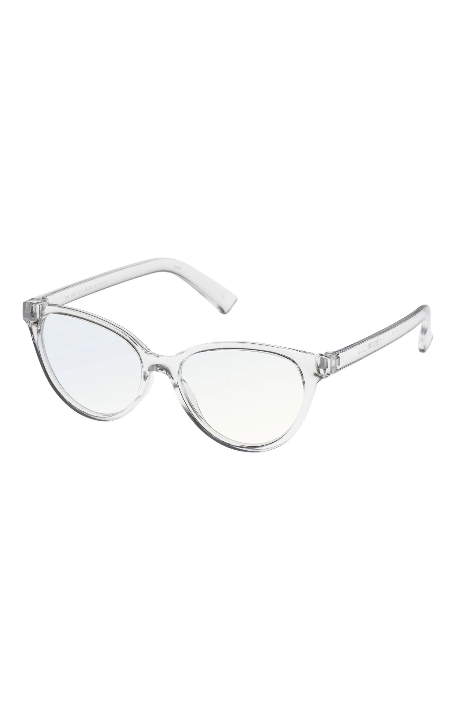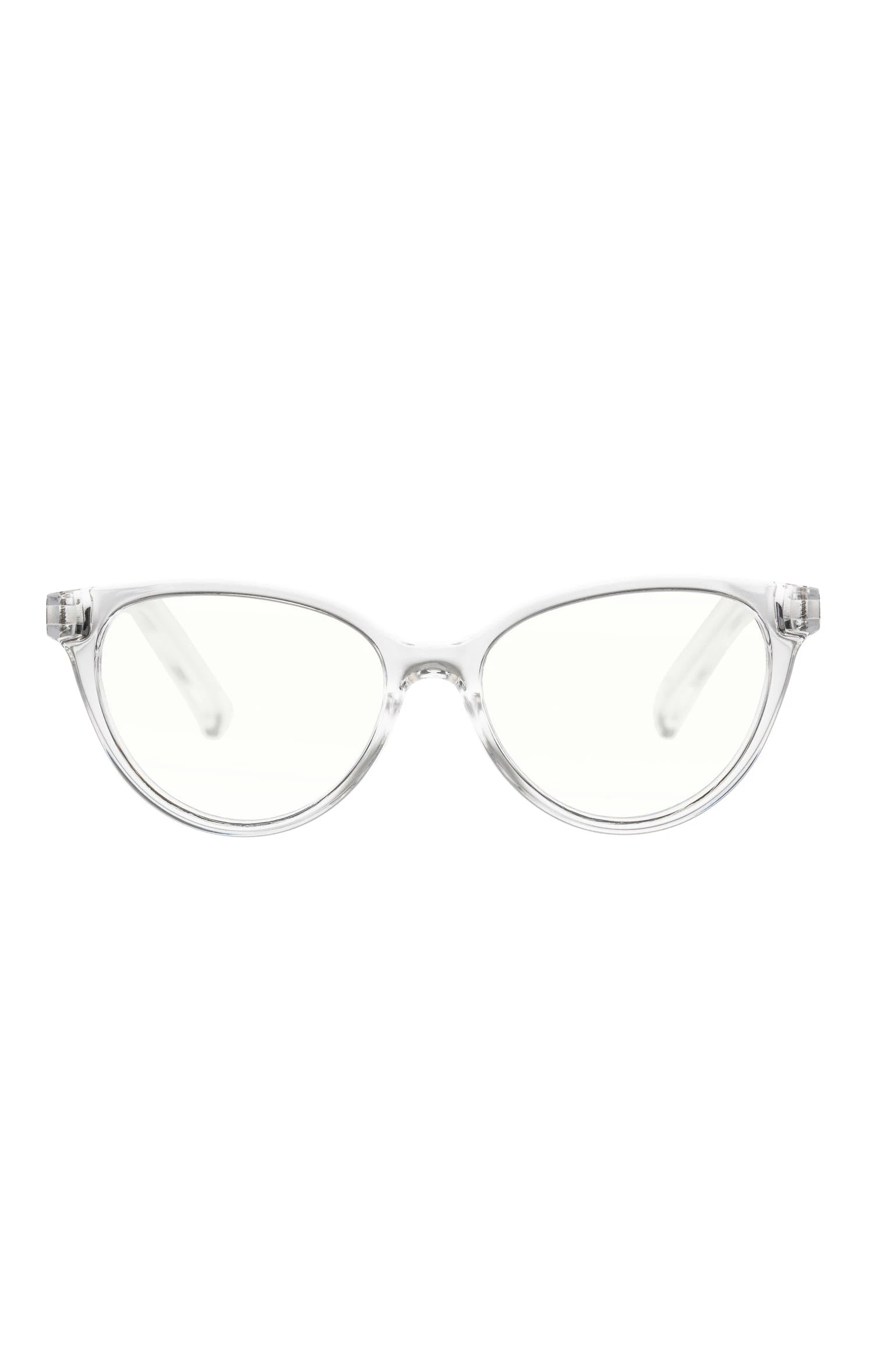 The art of blue light glasses are a clear classic cat-eye shape for the everyday. Lightweight comfort delivered in glassy crystal clear recyclable plastic for a fresh gaze.
