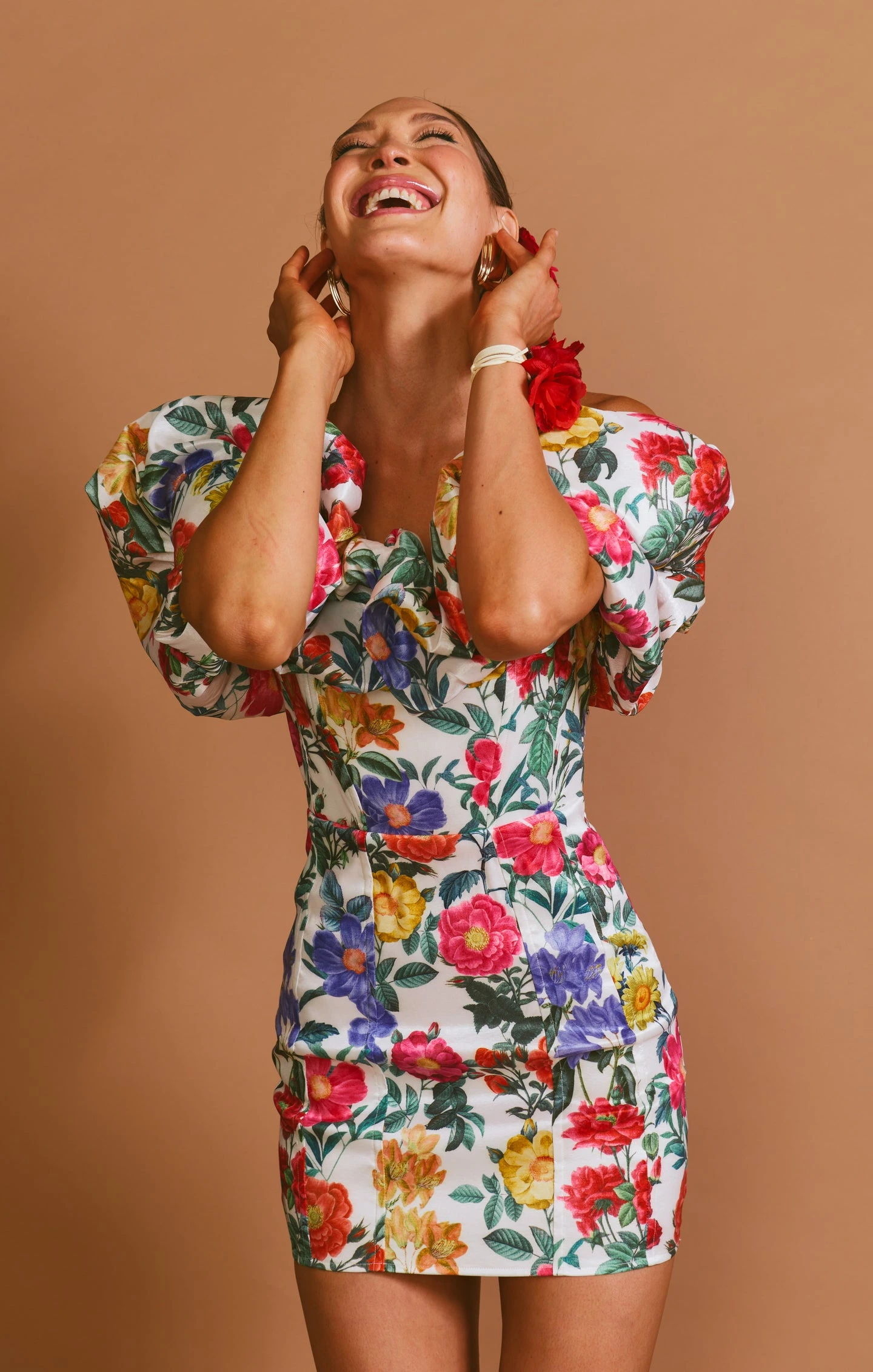 Major drama is right in this extravagant micro mini! A princess seamed bodice topped with an exaggerated off the shoulder poof detail. All eyes on you styled with platforms and dainty jewelry.