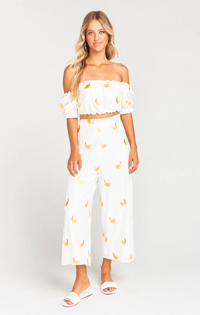 The perfect crop that everyone will go bananas for! This top features a banana print and elastic lining at the arms, chest and waist. Pair this top with your fave MuMu blues and sandals and you’ll have the perfect summer time look!