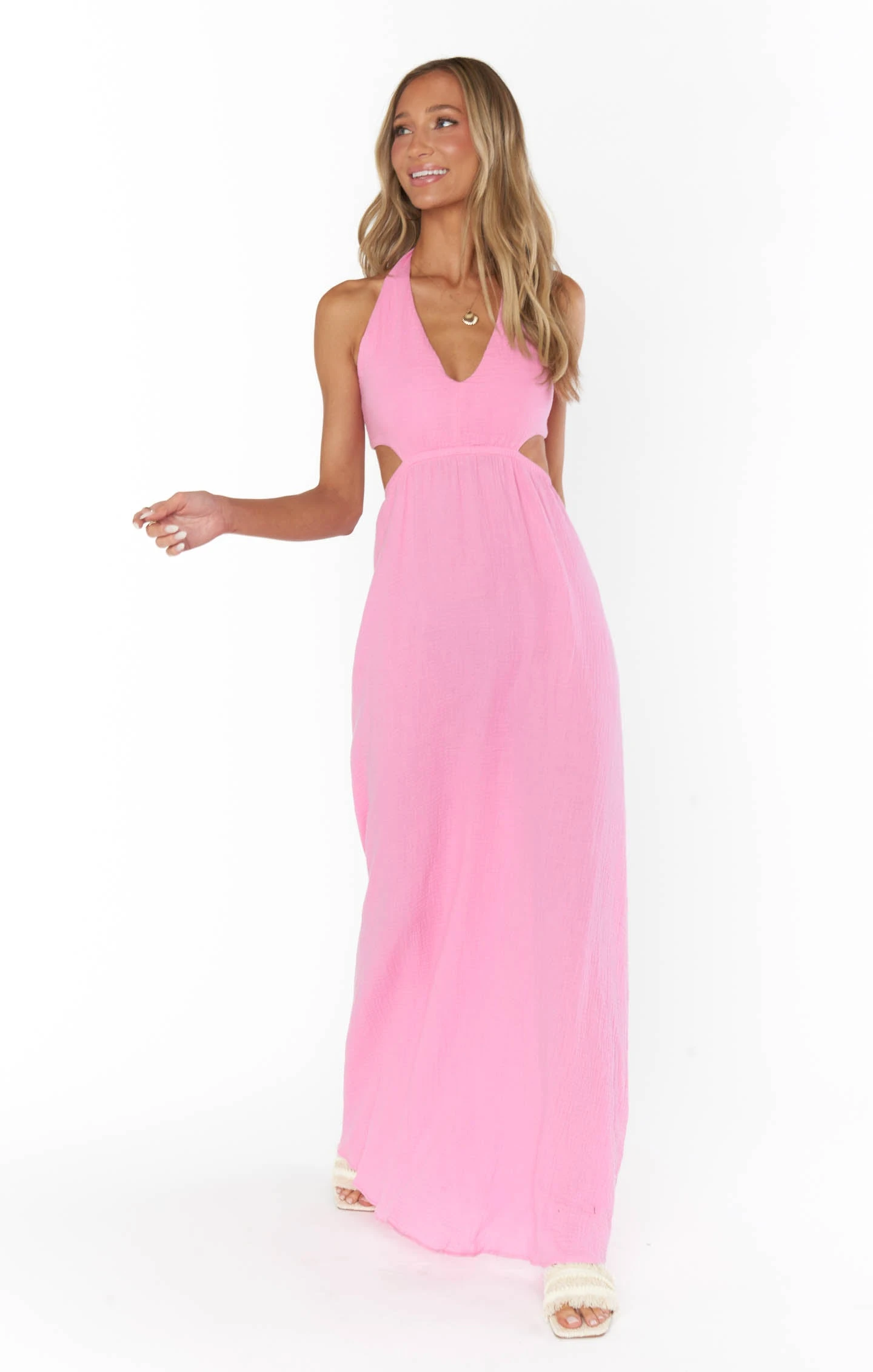 Take in the views and enjoy the scenery in style wearing the Marisol Maxi Dress! Lightweight bubblegum gauze fabric shapes a v-neck bodice with flirty side cutouts, held up by a halter neck and open tie back. We love her dressed up with platforms and layered gold accessories, or paired with sandals and rattan hat for a laid back vibe.