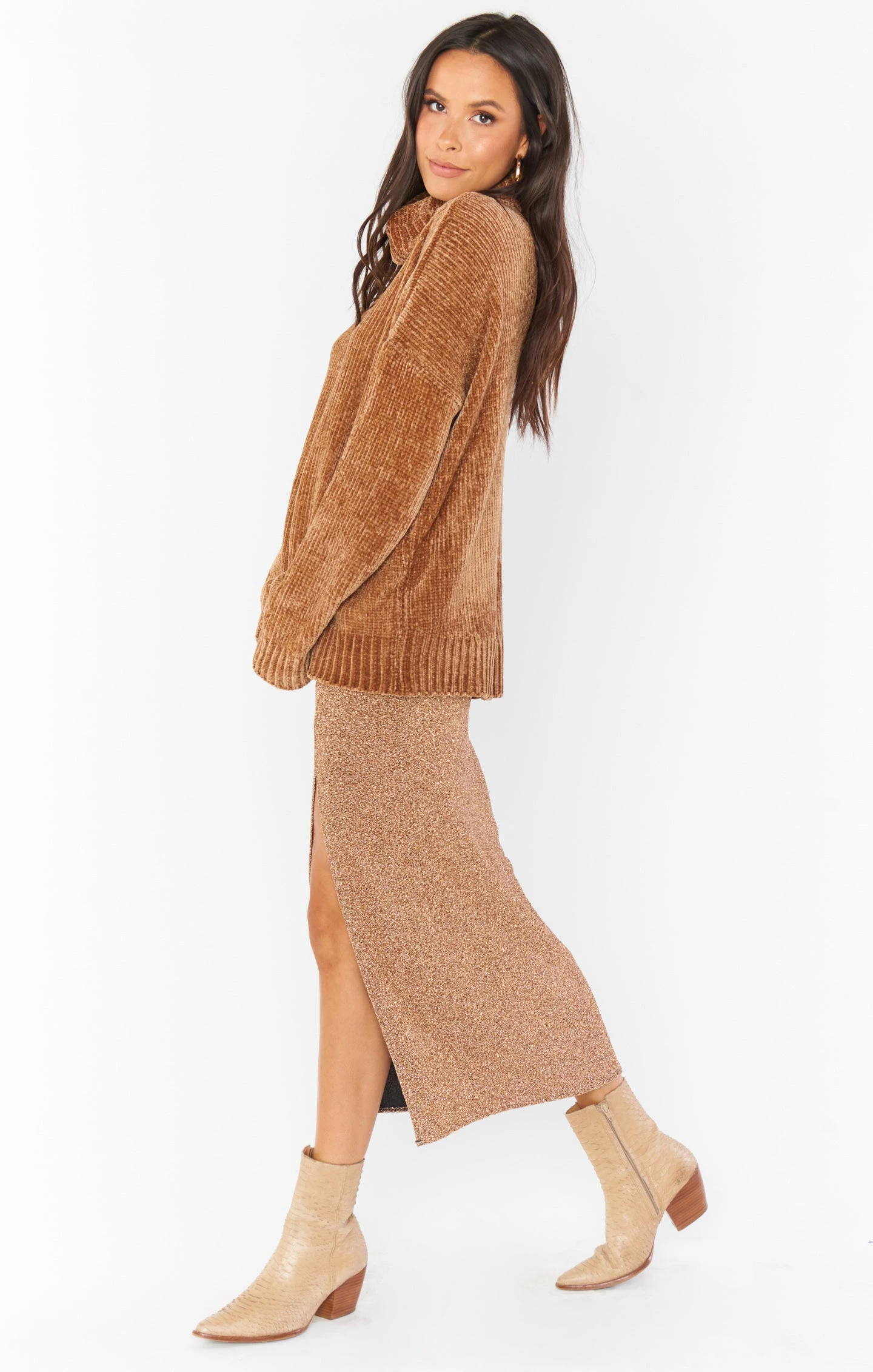 Take your outfit to the next level with this gold midi slip skirt! You will love the subtle sparkle of this shimmy shine fabric, the perfect thigh high side slit and seamless elastic waistband. Pair with your favorite boots and adorable cozy sweater for a look that can go day to night!