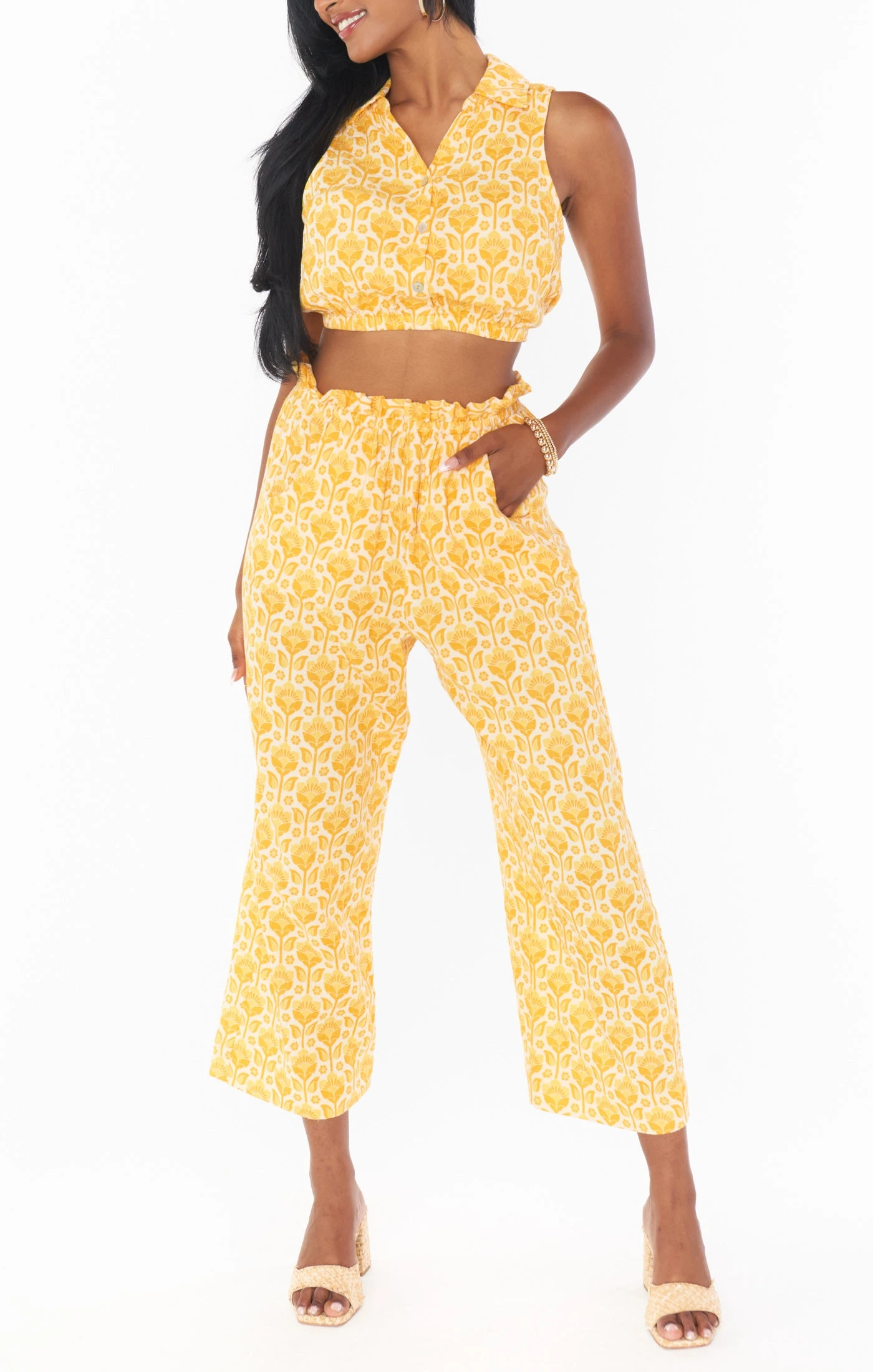 Do we hear somewhere sunny calling your name? Head out in these breezy pants. A sunny floral printed fabric shapes a high waisted silhouette that features an elastic waist and cropped wide leg. Style with your favorite tank or get the full look with our Camden Collared Top in Golden Fields.