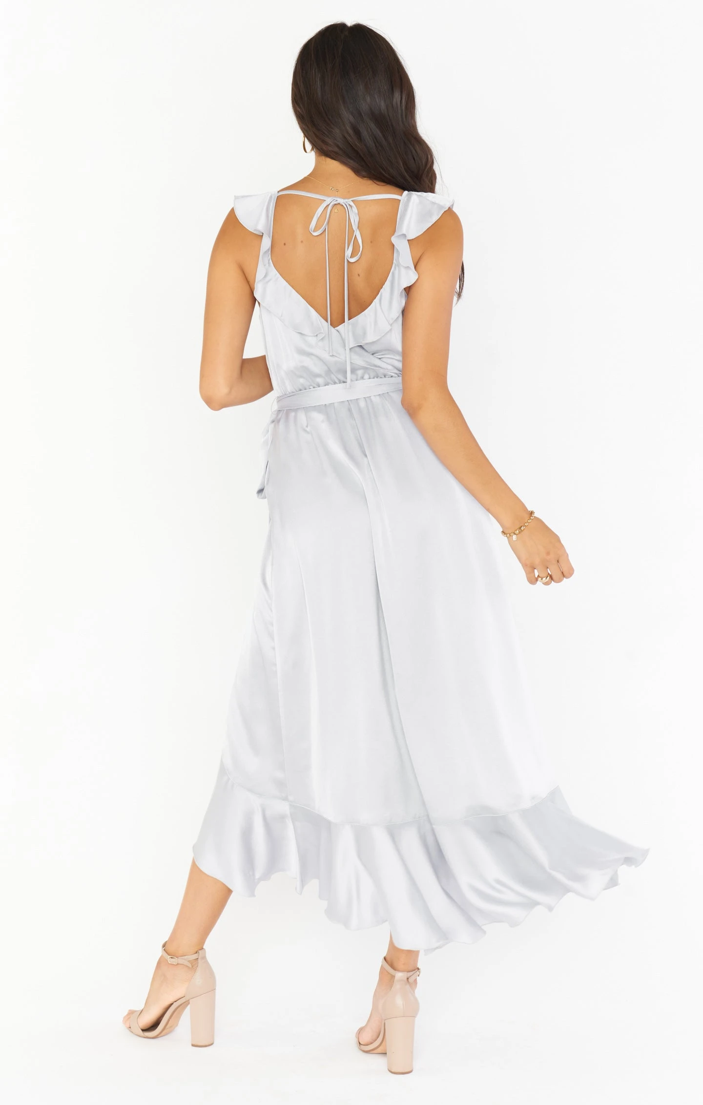 Show Me Your Mumu Samantha Ruffle Wrap Dress ~ Silver Luxe Satin