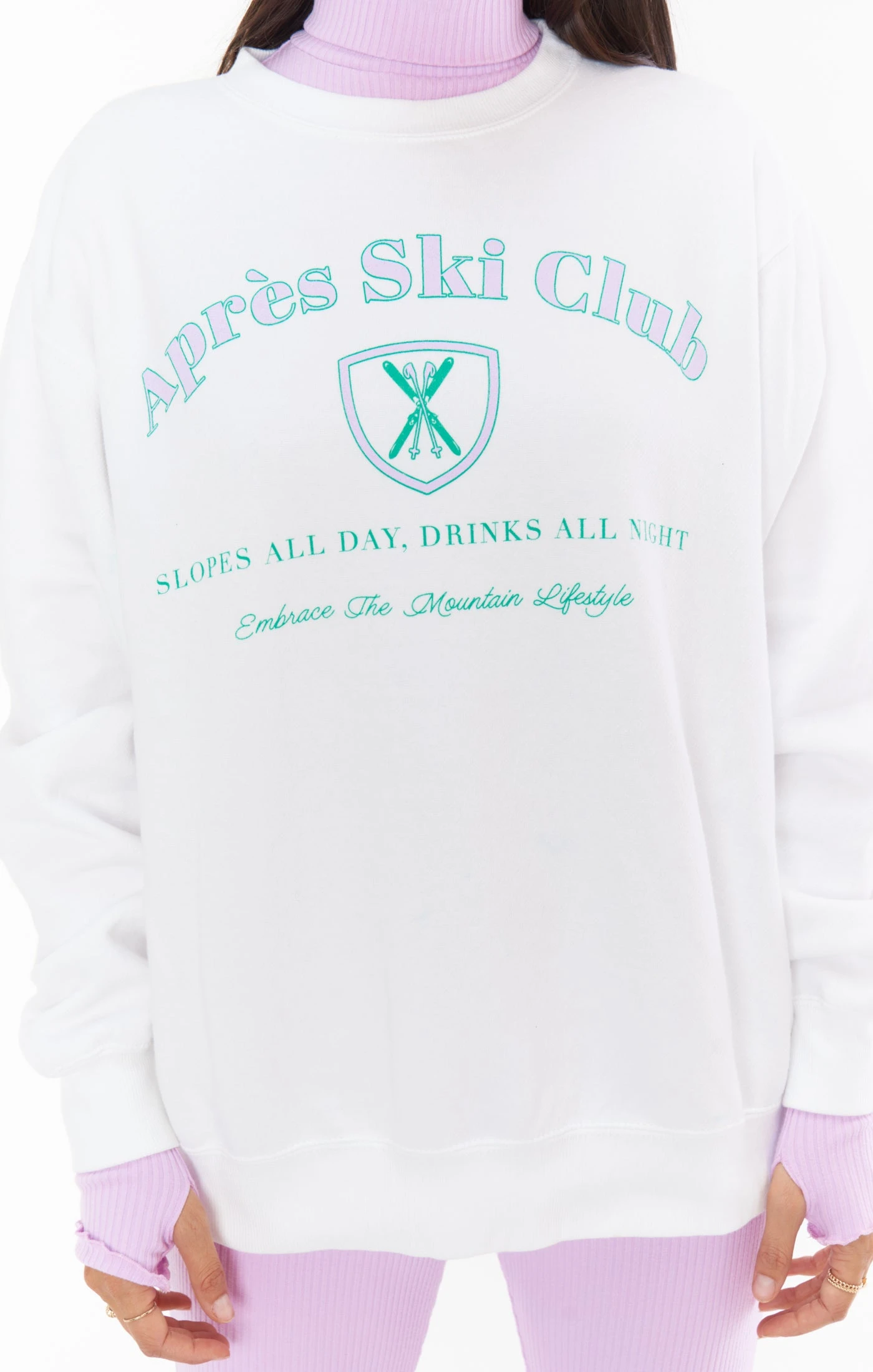 Hit the slopes in this perfect comfy white sweatshirt in our classic crew neck cut with an oversized fit. An easy throw on outfit for cozying up by the fire or running errands.