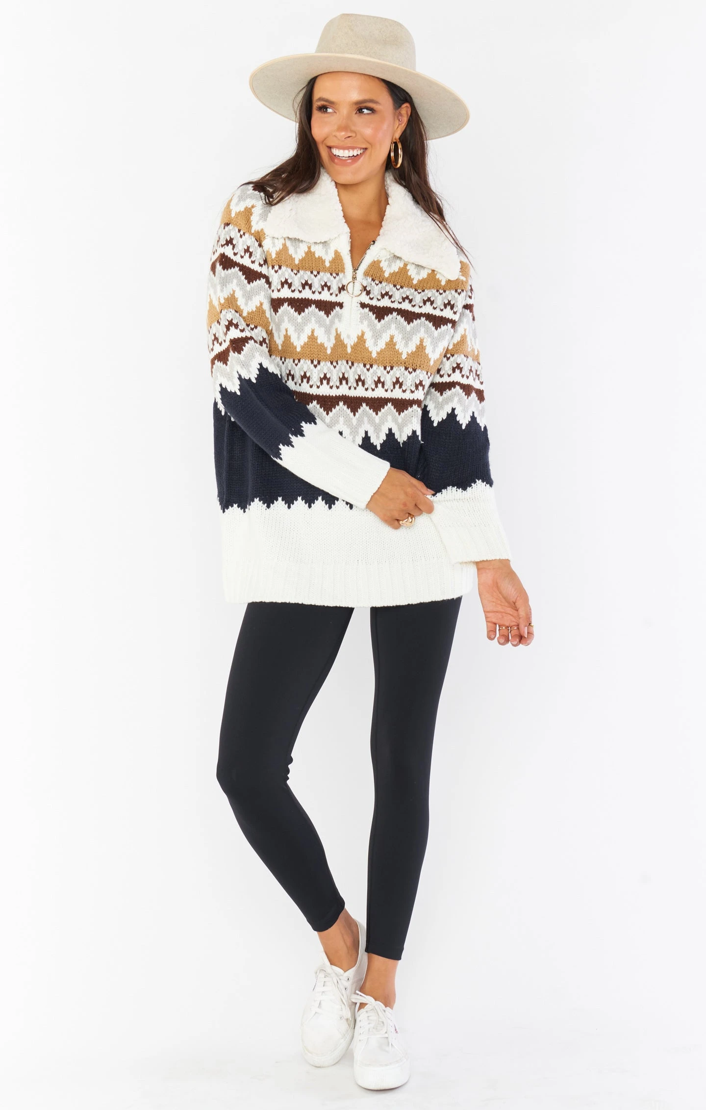 Get ready for your next ski mountain adventure in this earth toned pullover! Created for warmth and style we paired an o-ring half zip, faux sherpa collar and adorable fair isle knit pattern for the perfect winter sweater!