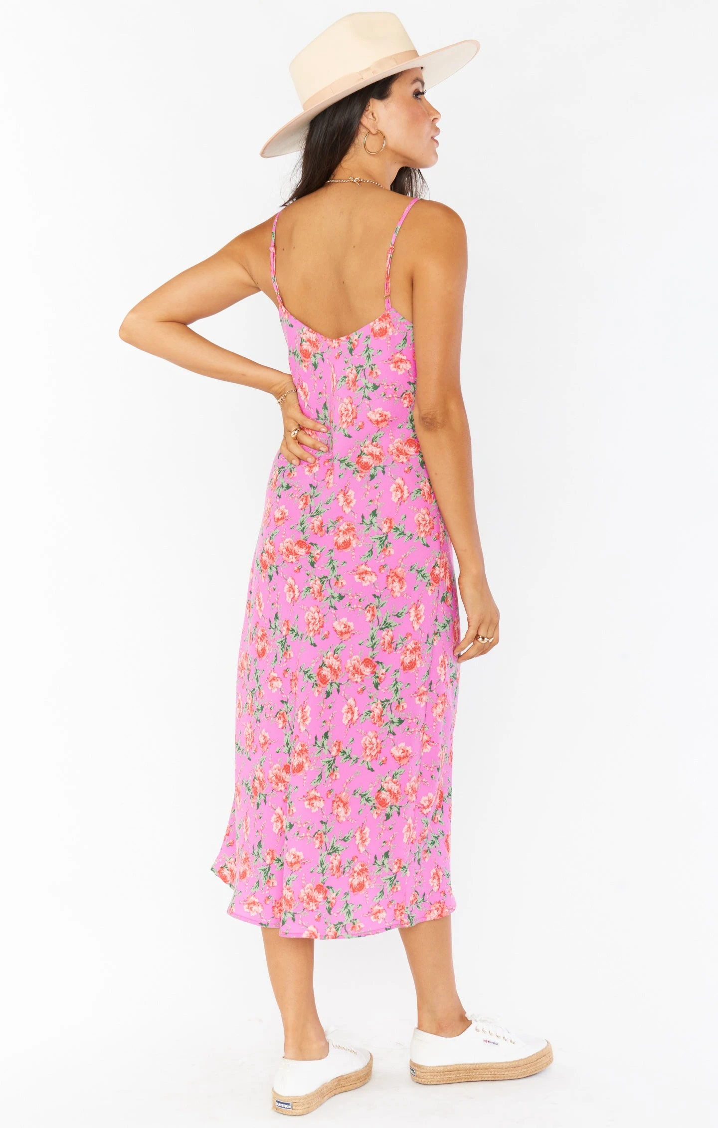 A flattering v-neck, spaghetti straps and a midi length make this pink floral slip dress your new go-to. Whether you dress is up with a chic heel or keep her chill with a sneaker the Zio is the perfect throw on for any occasion.